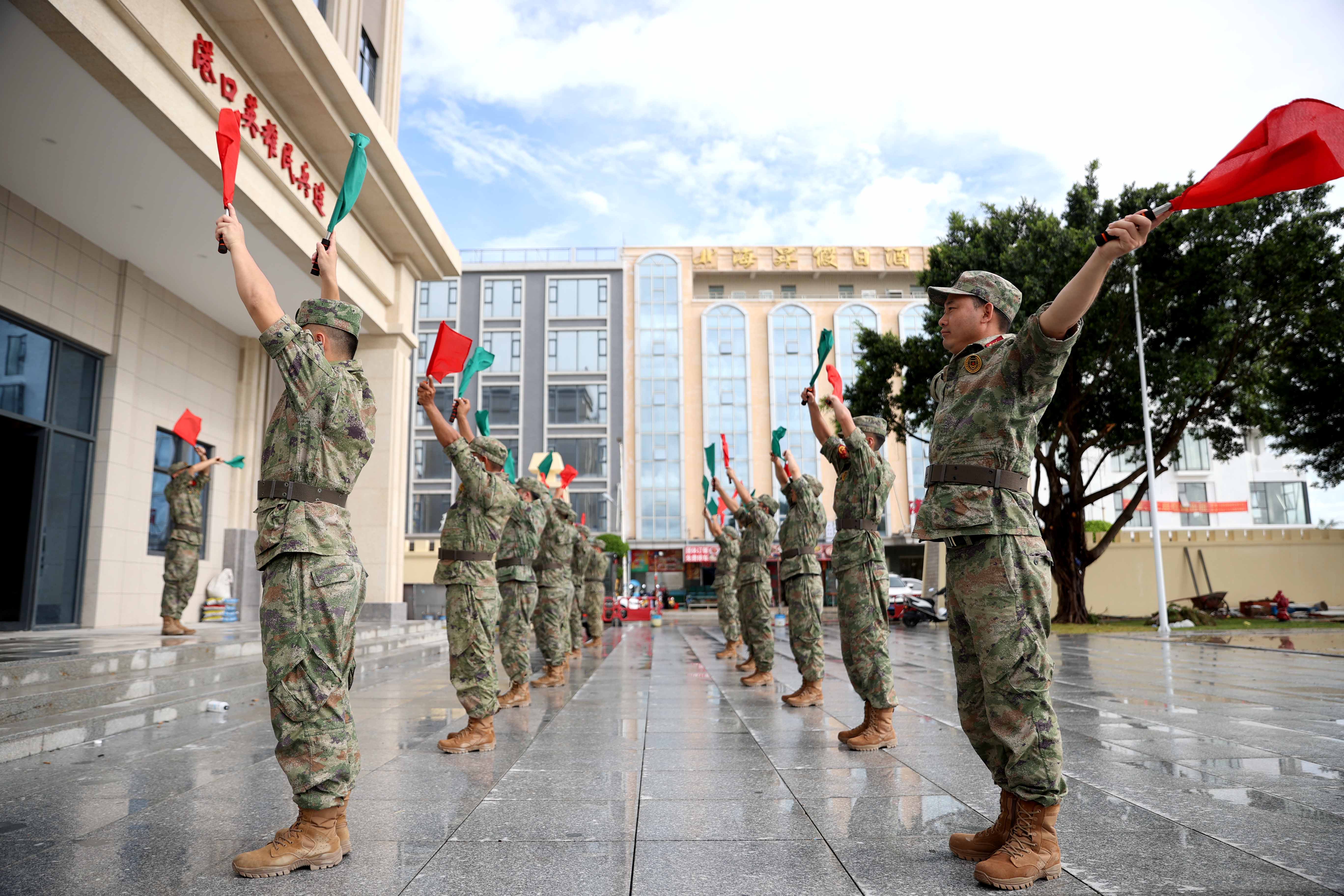 惠東縣港口英雄民兵連的民兵在進(jìn)行指揮交通旗語(yǔ)訓(xùn)練。