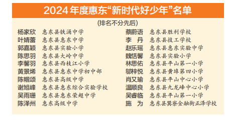 接下來,惠東縣將持續(xù)加大未成年人思想道德建設工作和先進典型的宣傳力度,進一步挖掘德育教育資源,豐富德育教育內涵,發(fā)揮“新時代好少年”的榜樣作用,示范引領全縣少年兒童爭做有志向、有夢想,愛學習、愛勞動,懂感恩、懂友善,敢創(chuàng)新、敢奮斗,德智體美勞全面發(fā)展的新時代好少年。