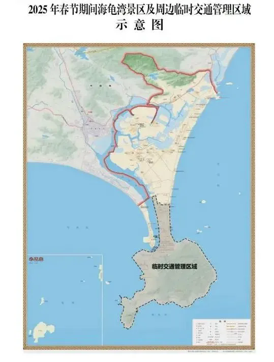 為確保2025年春節(jié)期間海龜灣景區(qū)道路交通有序、安全,根據(jù)《中華人民共和國道路交通安全法》《中華人民共和國道路運(yùn)輸條例》相關(guān)規(guī)定,決定在春節(jié)期間對海龜灣景區(qū)及周邊區(qū)域道路實施臨時交通管理和配套服務(wù)措施。現(xiàn)將有關(guān)事項通告如下: