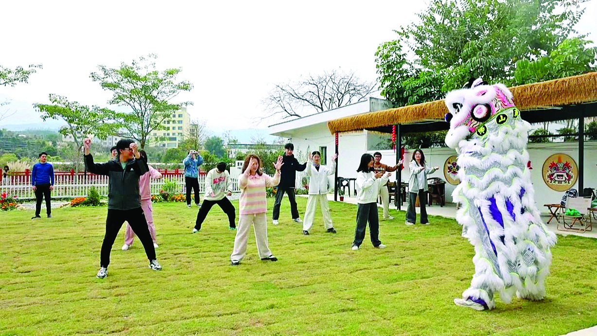 游客在白盆珠鎮(zhèn)民宿體驗(yàn)舞獅非遺文化。