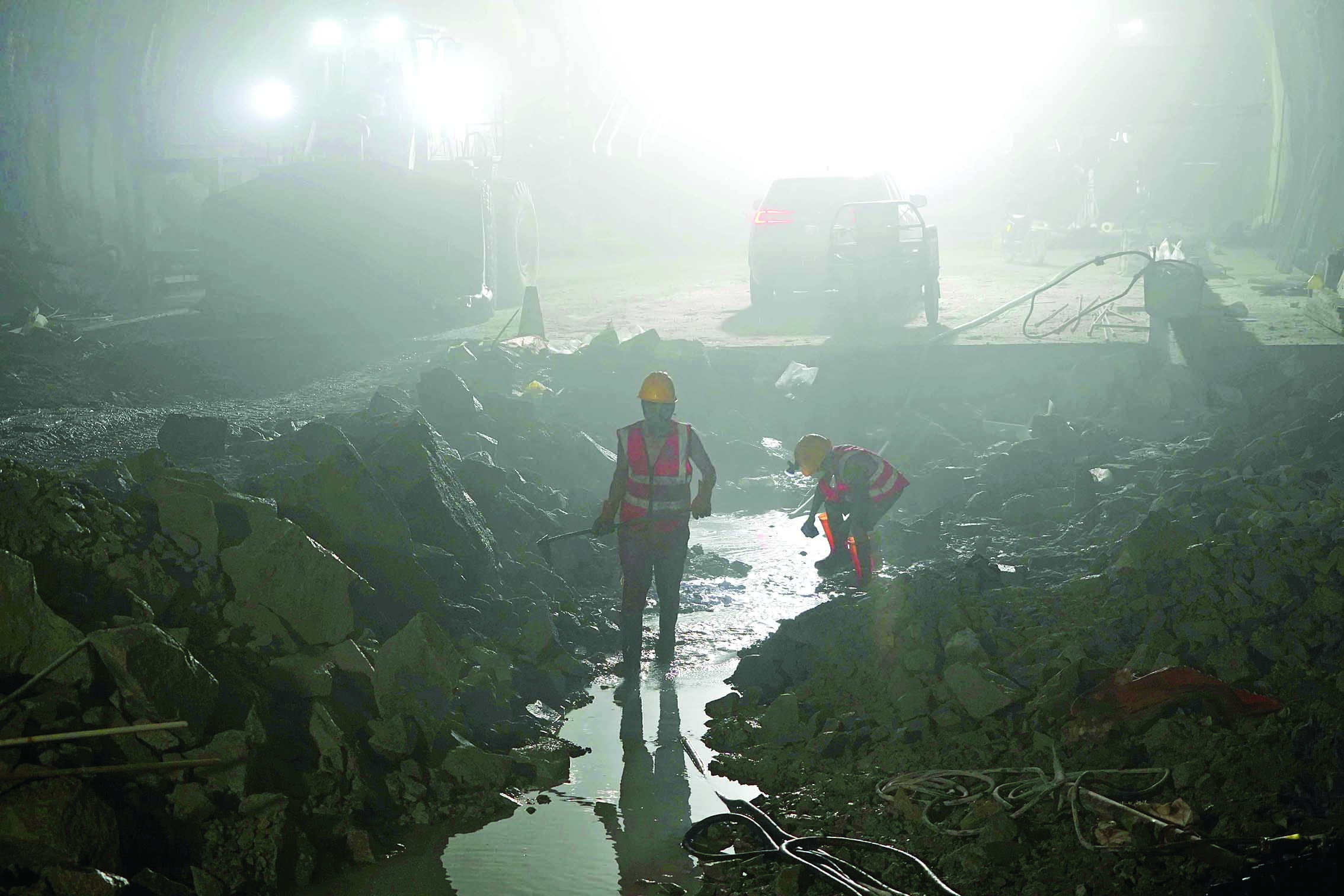 到達(dá)距離洞口1000多米的作業(yè)面時,一股潮濕、悶熱的氣息撲面而來。不一會兒,大顆大顆的汗珠便從徐曉貴的額尖滑落,他來不及擦拭,雙手熟練操作著機器設(shè)備,將一斗斗渣土倒進自卸車內(nèi)。不遠(yuǎn)處,開挖班幾名施工人員正蹚著渾濁的泥水,尋找新的作業(yè)點。