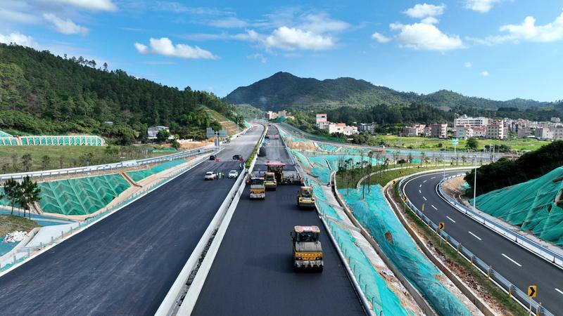 惠州稔平環(huán)島高速赤砂互通立交路段在鋪設(shè)瀝青。