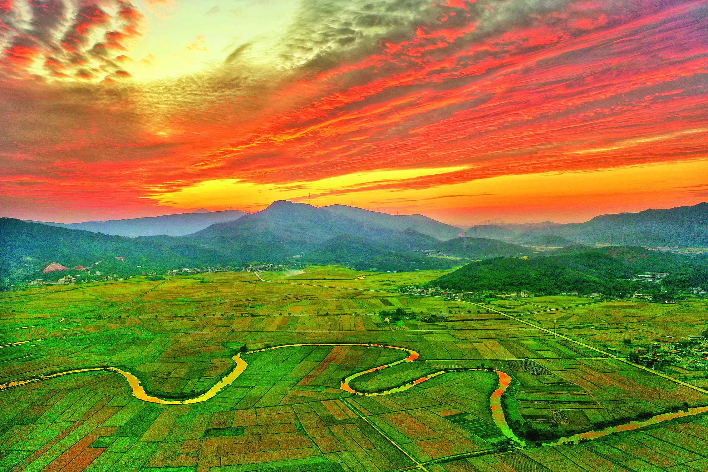 秋日傍晚,惠東縣稔山鎮(zhèn)竹園村稻田一片美麗景象。航拍視角下,黃綠稻浪如調(diào)色盤(pán)鋪展,蜿蜒河流在晚霞下泛著金波,與遠(yuǎn)山、絢爛云霞構(gòu)成夢(mèng)幻畫(huà)卷。