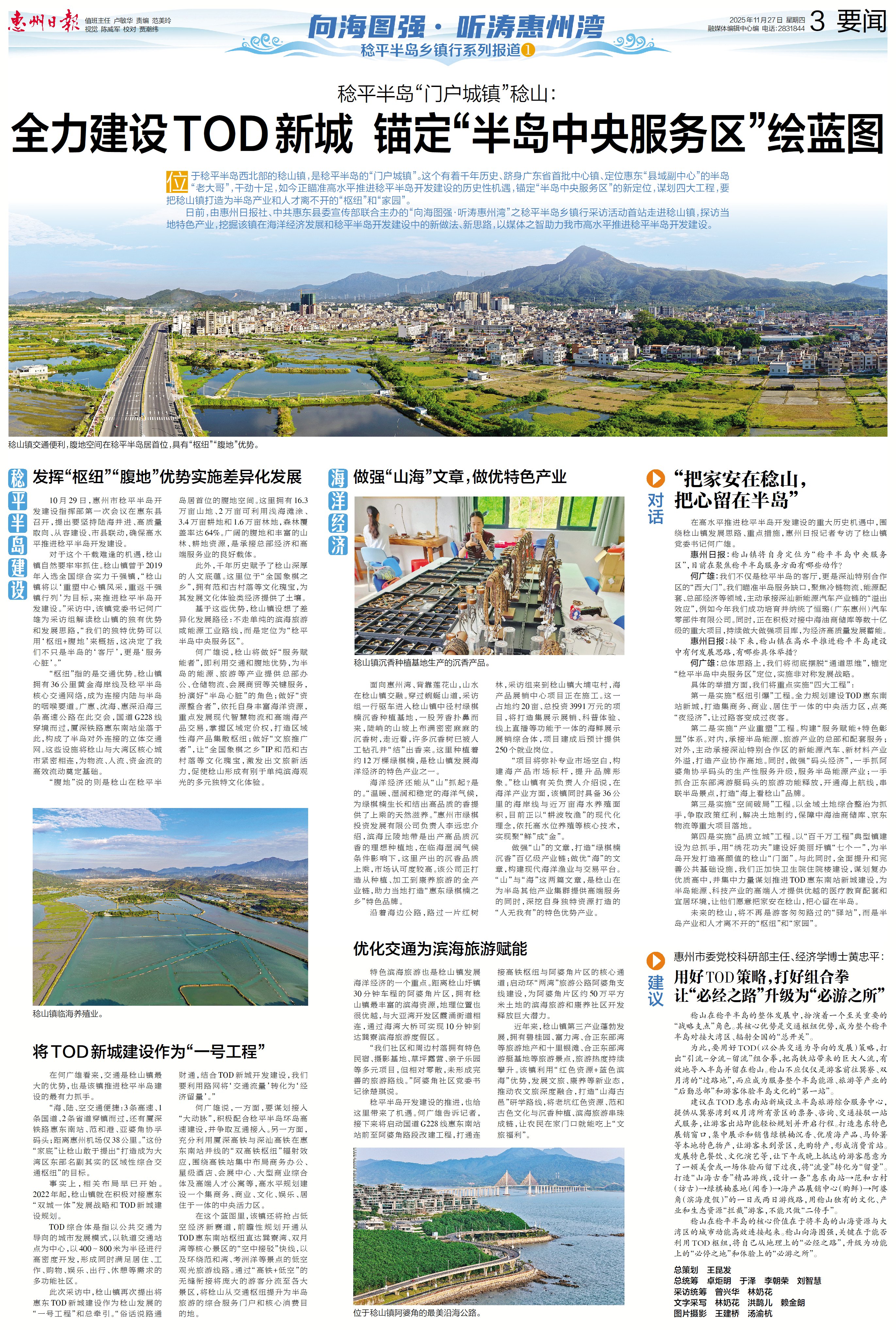 惠州日報訊 (記者林奶花 賴金朗)稔平半島是惠州大力發(fā)展海洋經(jīng)濟(jì)的主戰(zhàn)場、打造廣東高質(zhì)量發(fā)展新增長極的重大平臺。日前,“向海圖強(qiáng)·聽濤惠州灣”之稔平半島鄉(xiāng)鎮(zhèn)行采訪活動啟動,首站走進(jìn)稔山鎮(zhèn)。據(jù)悉,稔山鎮(zhèn)計劃錨定“稔平半島中央服務(wù)區(qū)”定位,并將惠東TOD新城建設(shè)作為稔山發(fā)展的“一號工程”和總牽引,利用路網(wǎng)將“交通流量”轉(zhuǎn)化為“經(jīng)濟(jì)留量”。
