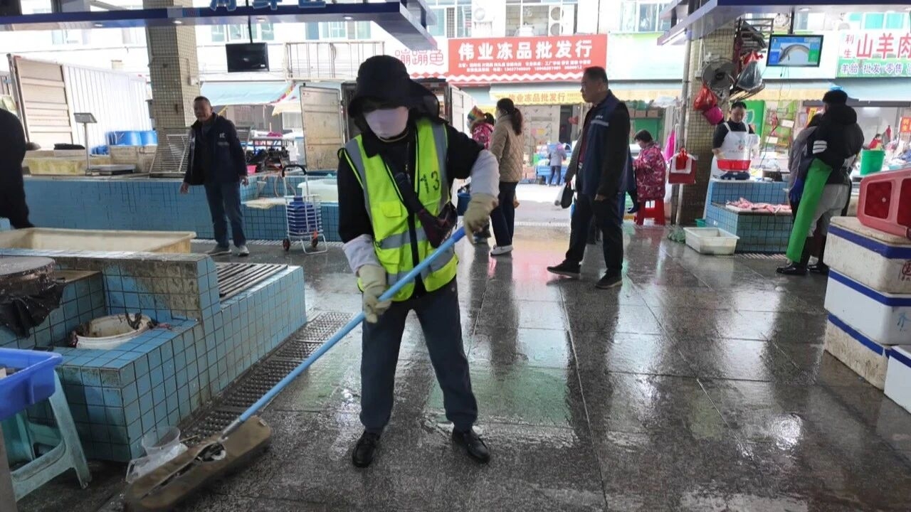記者在平山街道華僑城農(nóng)貿(mào)市場看到,工作人員正在開展環(huán)境整治行動(dòng)。在市場入口及通道處,工作人員指導(dǎo)商戶將占道經(jīng)營的菜籃、貨物規(guī)整至經(jīng)營區(qū)內(nèi),對亂停亂放的摩托車、電動(dòng)車進(jìn)行統(tǒng)一疏導(dǎo),引導(dǎo)車主有序停放至指定區(qū)域,確保市場通道暢通。針對市場內(nèi)散落的菜葉、果皮等垃圾,工作人員手持掃把、掃帚進(jìn)行清掃;在魚肉檔口等易產(chǎn)生積水的區(qū)域,工作人員用大拖把反復(fù)擦拭地面,及時(shí)清理地面積水,消除了地面濕滑帶來的安全隱患。