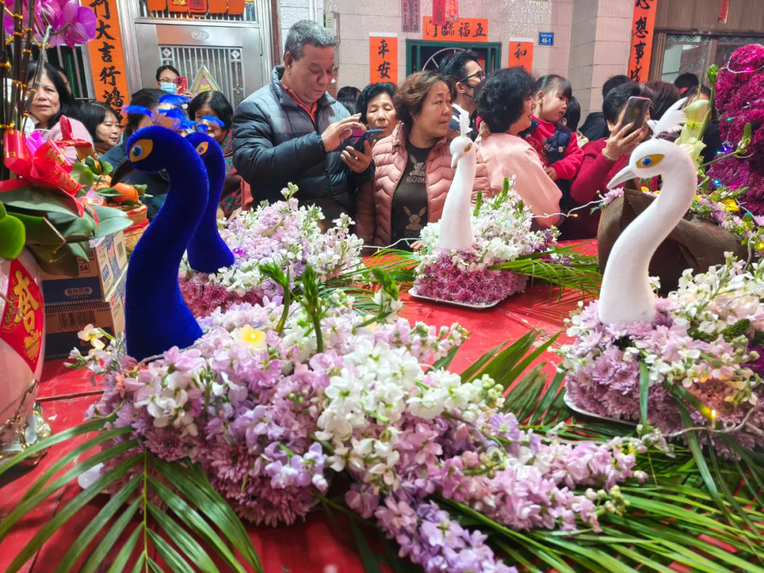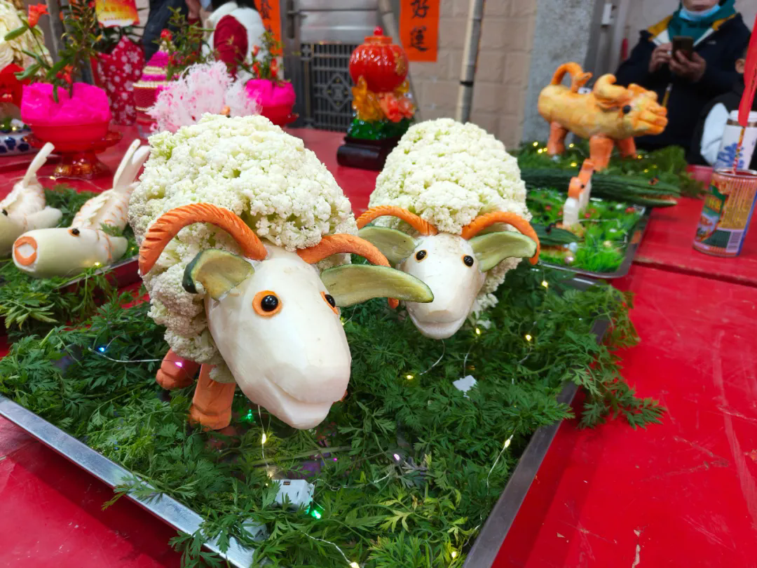 記者看到,現(xiàn)場(chǎng)堪稱一場(chǎng)大型手工藝作品展,所展出的作品不僅技藝精湛,而且創(chuàng)意十足。巨型冬瓜雕刻成高峻的山峰,蘿卜做成栩栩如生的鯉魚(yú)、展翅欲飛的白鶴,用蔬菜巧妙地制作出可愛(ài)的玩偶,還有以花貼身、扎制而成的“花馬”、一樹(shù)閃燈的“發(fā)財(cái)樹(shù)”、像蓮花盛開(kāi)的發(fā)糕等,在燈光下熠熠生輝,每一件作品都讓人賞心悅目,充分展示了制作者的智慧和才華。