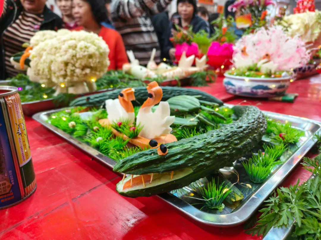 惠東縣政協(xié)文史研究員汪潔介紹,平!皵[盤”習(xí)俗最初于明嘉靖年間形成,當(dāng)時(shí)城內(nèi)百姓為迎接抗倭將士凱旋,自發(fā)在街道擺放果、酒、肉等食物犒勞士兵。隨著時(shí)間推移,逐漸演變?yōu)橐允止に嚻、果蔬雕刻等藝術(shù)形式為主的慶;顒(dòng),成為記錄平海古城變遷的“活化石”。這一習(xí)俗不僅承載著平海人民對(duì)抗倭歷史的集體記憶,更通過(guò)不斷地創(chuàng)新延續(xù)了民俗的生命力。