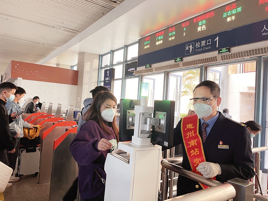 春運期間,惠州南站工作人員引導(dǎo)旅客通過自助檢票閘機。 惠州日報記者許文昌 通訊員劉綠平 攝