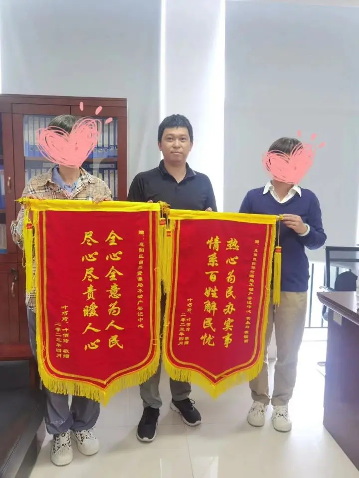 小小一本證,牽動萬家心!胺浅8兄x不動產(chǎn)登記中心為我們家解決了存在多年的歷史難題,拿到了不動產(chǎn)權(quán)證,心里總算是踏實(shí)了!比涨埃忻袢~氏姐妹來到惠陽區(qū)不動產(chǎn)登記中心,送上印有“全心全意為人民 盡心盡責(zé)暖人心”“熱心為民辦實(shí)事 情系百姓解民憂”兩面錦旗,以此感謝該中心幫助她們解決了困擾多年的辦證難題。