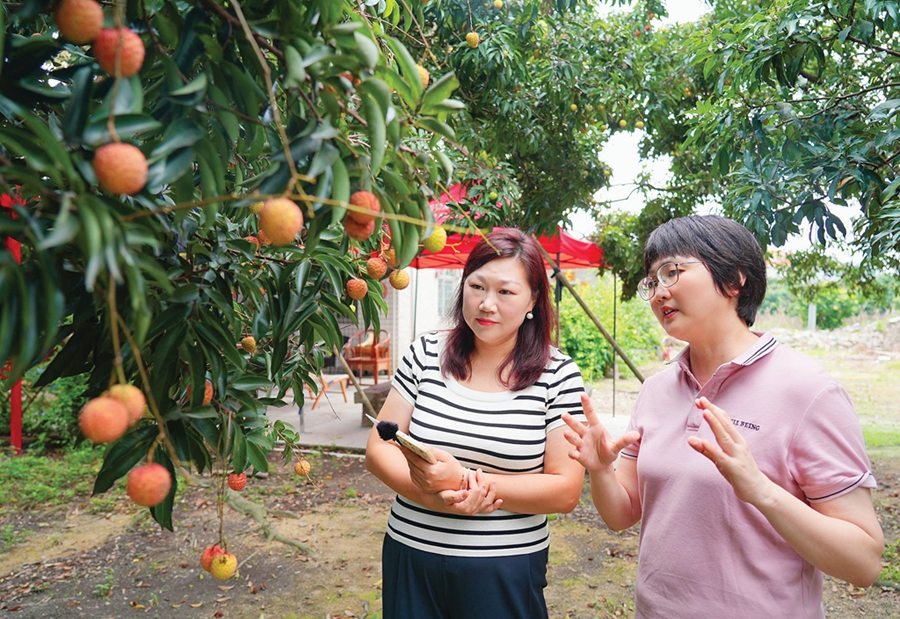 宏美春(右)介紹荔枝生長(zhǎng)情況。 惠州日?qǐng)?bào)記者許文昌 攝