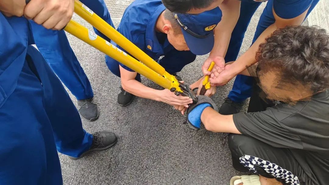 消防員查看情況后,發(fā)現(xiàn)男子手腕處被手銬緊緊卡住,內(nèi)部鎖芯損壞,無法使用鑰匙打開,了解情況后,消防員決定使用絕緣剪進(jìn)行處理,為防止剪切過程中手銬受力變形造成的疼痛和對手的傷害,消防員將男子的手固定住,一邊安撫其情緒,一邊不斷調(diào)整剪切位置,快速找到其最佳突破口,幾分鐘后,隨著“咔嚓”一聲,手銬被剪開。