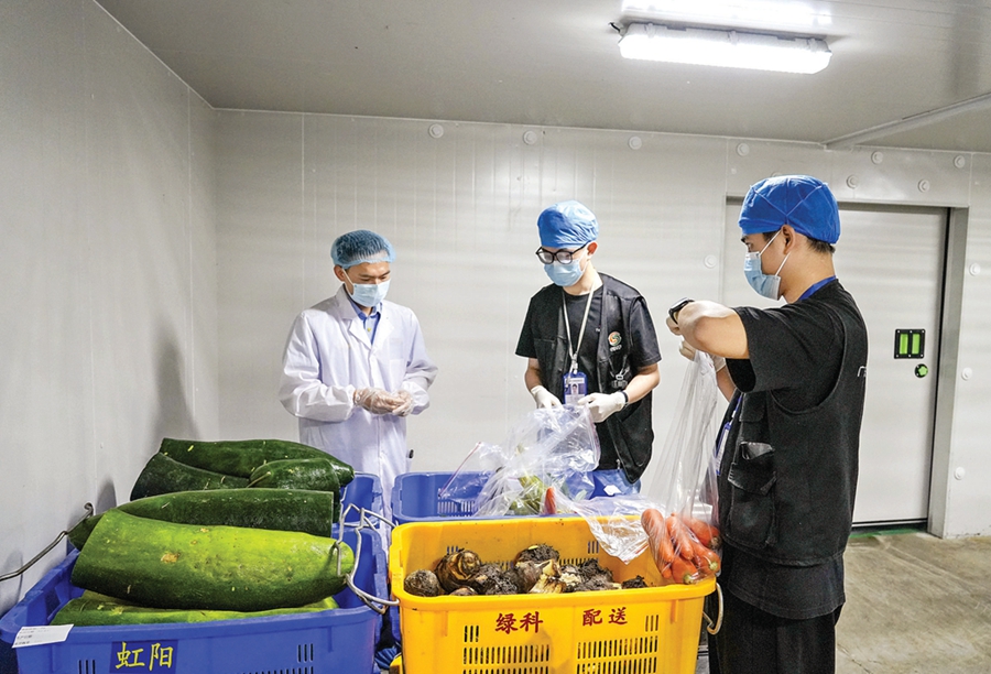 市場監(jiān)管執(zhí)法人員檢查配餐企業(yè)生產(chǎn)情況。