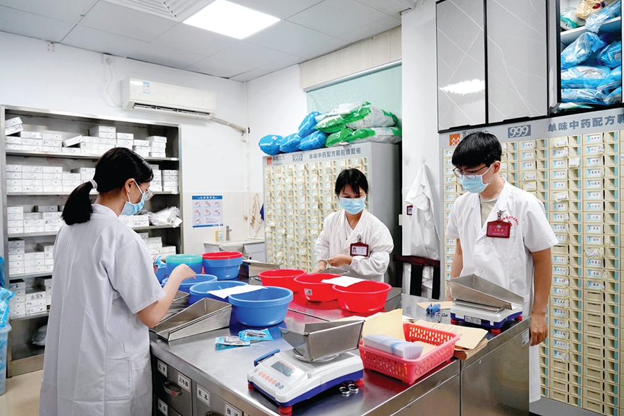 醫(yī)護人員正在中藥房按方抓藥。
