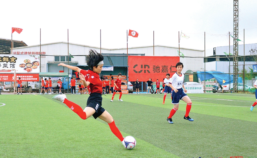 三和中學(xué)女子足球隊(duì)(紅衣者)在比賽現(xiàn)場(chǎng),英姿颯爽。