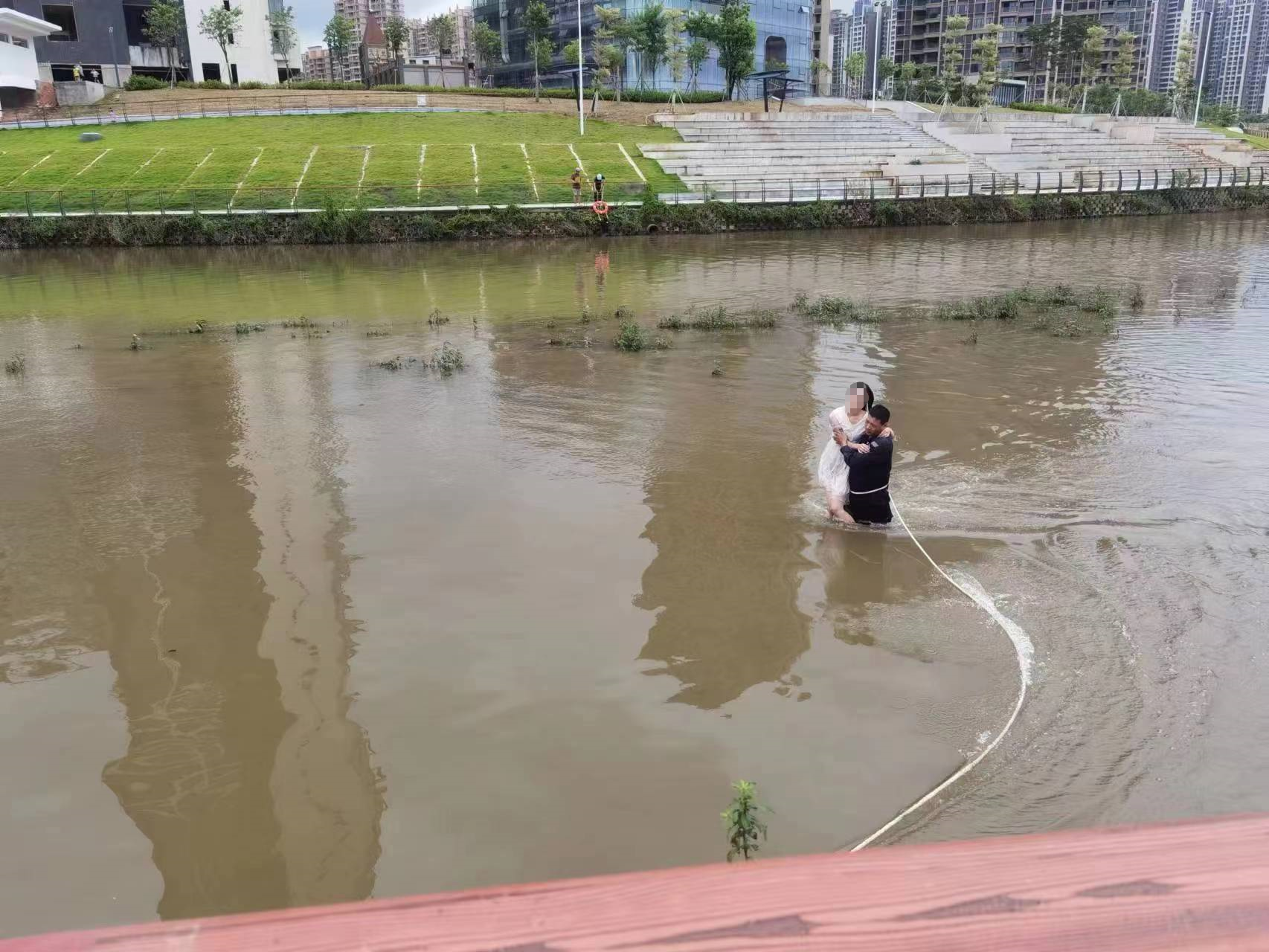 在呼喊女子毫無(wú)反應(yīng)時(shí),隊(duì)員陳春敬立即找繩索套在自己的腰間,跳入河中,以最快的速度往女子方向靠近。