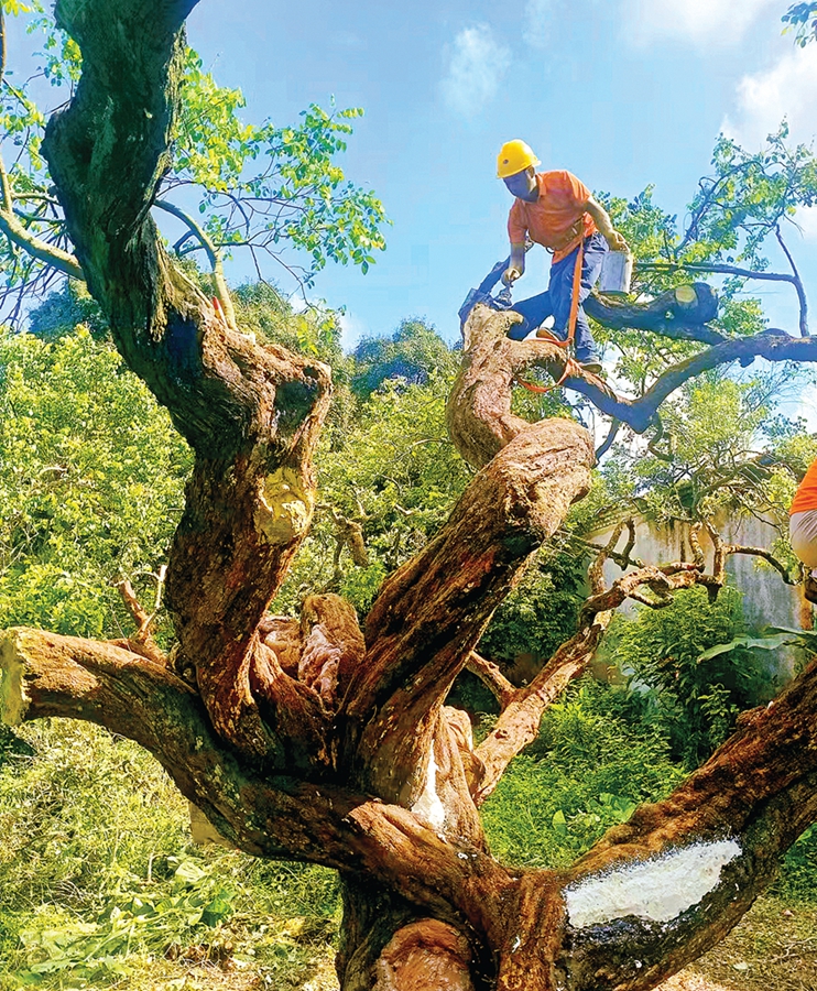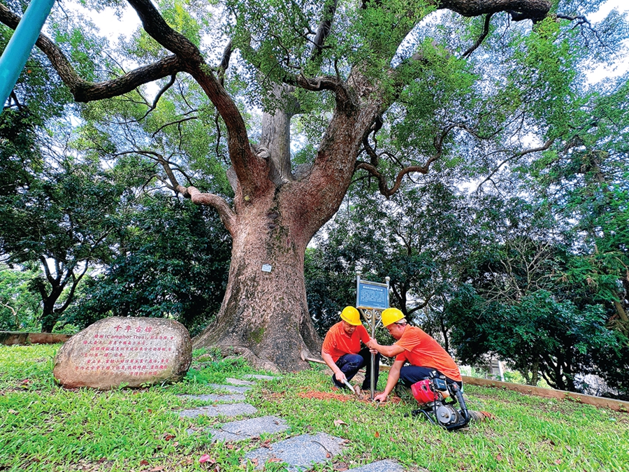 工人在古樹(shù)旁豎保護(hù)牌。 惠州日?qǐng)?bào)記者李芳娟 攝