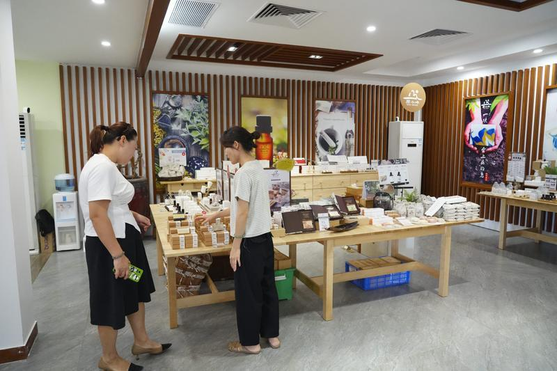 在公司市場經(jīng)理劉韻霏的帶領(lǐng)下,記者參觀了園區(qū)內(nèi)的植物園,來自寶島的牛樟、檜木、沉香等植物長勢不錯,摘下枝葉,就可萃取出精油和純露,以此為原材料制成的手工皂散發(fā)出大自然最質(zhì)樸的芬芳。