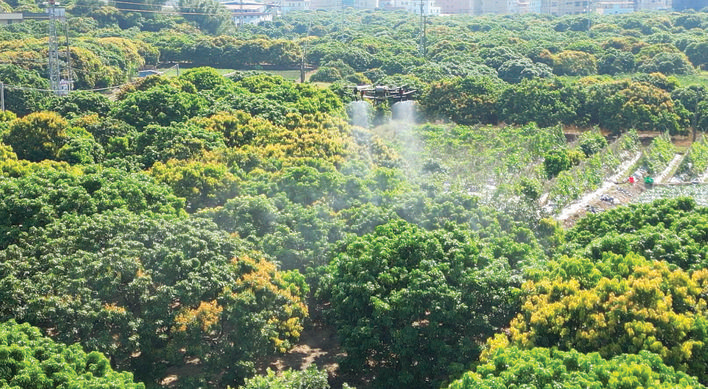 利用無人機(jī)給荔枝樹打藥省時(shí)省力。 惠州日?qǐng)?bào)記者李芳娟 通訊員張偉鋒 攝