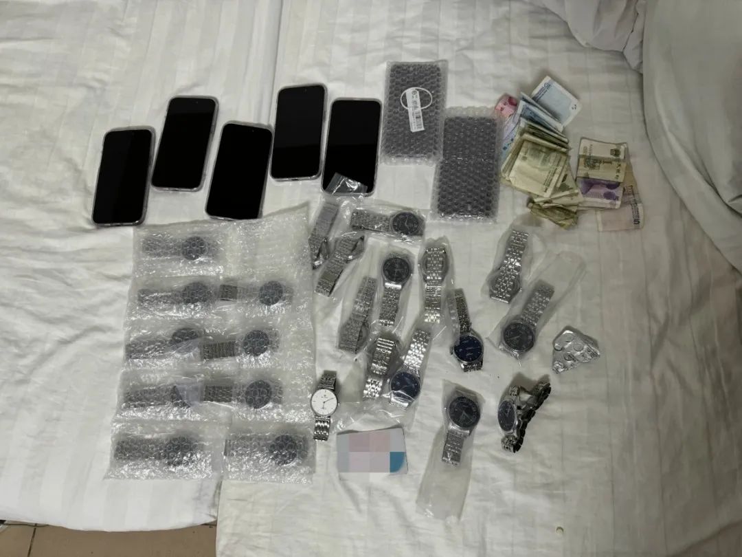 11月17日下午,辦案民警在秋長(zhǎng)街道秋南秋寶路一家賓館內(nèi)抓獲犯罪嫌疑人姜某等8人,現(xiàn)場(chǎng)收繳高仿手機(jī)15部、假名牌手表24塊。