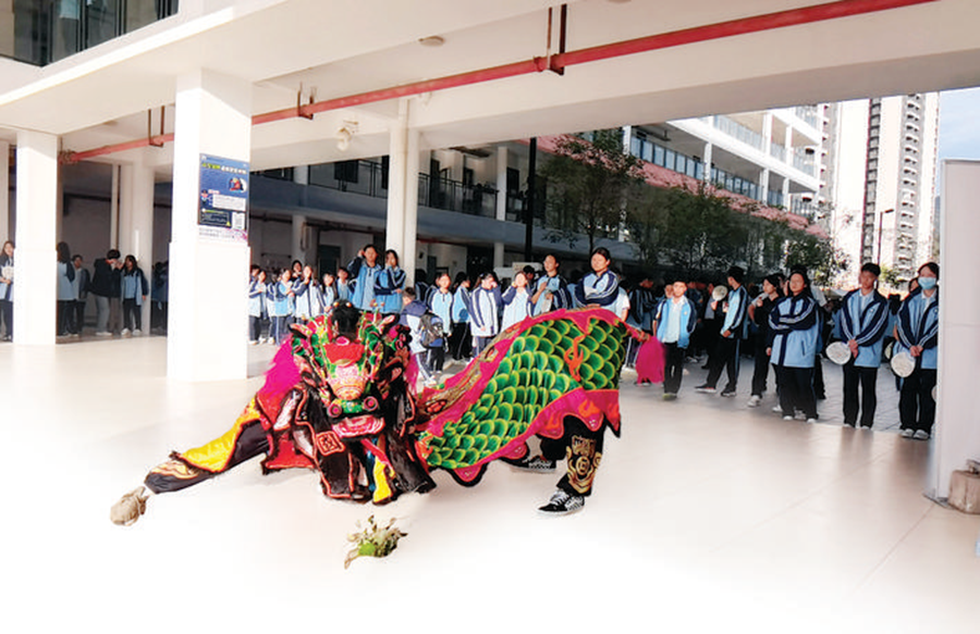“以前只是聽說舞麒麟,沒想到今天能在校園親眼看到,真是非常震撼!”正在圍觀市級(jí)非遺——沙田舞麒麟習(xí)俗表演的高二(7)班學(xué)生劉銘惠與同學(xué)們被這一精彩的傳統(tǒng)技藝所折服,紛紛鼓掌喝彩。