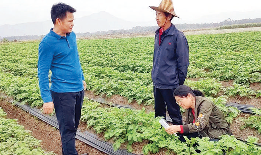 農(nóng)技專家在田間查看農(nóng)作物生長(zhǎng)情況。 惠州日?qǐng)?bào)記者許文昌 攝