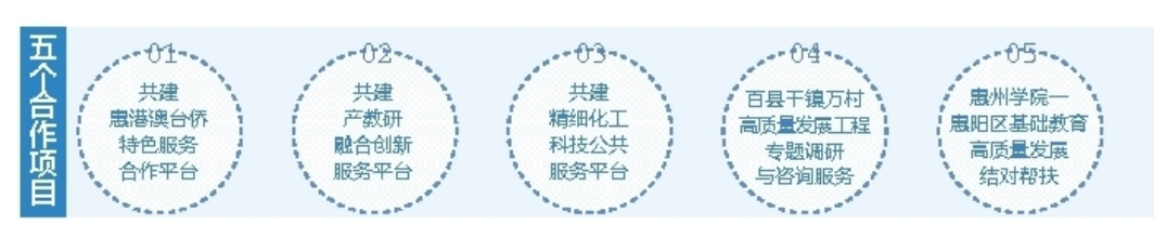 雙方先行在共建合作平臺、“百千萬工程”、基礎(chǔ)教育結(jié)對幫扶等三方面開展5個合作項目,包括共建惠港澳臺僑特色服務(wù)合作平臺、共建產(chǎn)教研融合創(chuàng)新服務(wù)平臺、共建精細化工科技公共服務(wù)平臺、“百縣千鎮(zhèn)萬村高質(zhì)量發(fā)展工程”專題調(diào)研與咨詢服務(wù)、惠州學(xué)院—惠陽區(qū)基礎(chǔ)教育高質(zhì)量發(fā)展結(jié)對幫扶。