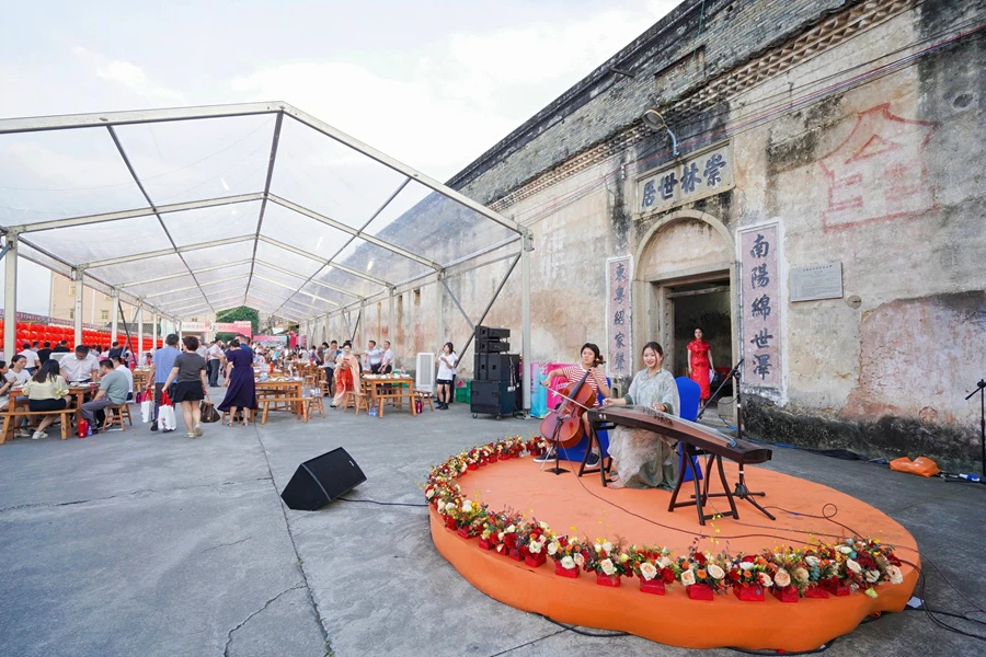 21日下午,記者在崇林世居看到,圍屋外圍張燈結彩,大紅燈籠高高掛起,門口已擺上了60桌圍桌,一張張古香古色的木桌,搭配著長板凳,傳統(tǒng)而熱鬧。大圍屋荔枝感恩活動于當晚6點拉開序幕!凹已纭币岳笾ψ鳛橹黝}菜品,并在現場設置了荔枝酒、荔枝餅干、荔枝雪糕等荔枝文創(chuàng)產品展銷和品嘗區(qū),聯誼海內外鄉(xiāng)親,同心共敘鄉(xiāng)情。