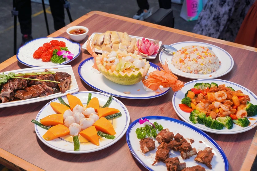 飯桌上七菜加炒飯,美味又創(chuàng)意?图胰苏写攲佟盁o雞不成宴”。貴妃荔枝雞是一道承載了鎮(zhèn)隆豐富文化內涵的佳肴,精選荔枝果園走地雞,用荔枝湯慢煮浸熟,為雞肉增添了獨特的荔枝果香。荔枝海味奇緣清爽解膩,荔枝與蝦球、哈密瓜、百合、芹菜等食材跨界混搭,是傳統(tǒng)海鮮烹飪的創(chuàng)新與融合。荔枝蝦球是一道創(chuàng)意與美味兼具的精致菜品,鮮嫩大蝦搭配爽脆的馬蹄巧妙地制成蝦球,裹上脆花粒入鍋油炸,出鍋后是一顆顆形如荔枝的精致炸物,幾乎以假亂真。荔香客家祿鵝采用鎮(zhèn)隆獨有的祿鵝烹飪方式,將荔枝的清香滲入鵝肉當中,使鵝肉充分吸收了荔枝的果香和清甜,同時自身的肉香也得以完美保留,并佐以秘制醬料,讓人口齒留香。荔枝咕嚕肉,將精選五花肉裹粉入鍋油炸成外層酥脆,佐以荔枝酸甜開胃,清爽不油膩,且散發(fā)著淡淡果香。還有醬香荔枝骨是一道結合了荔枝的果香與排骨肉香的新式菜品。