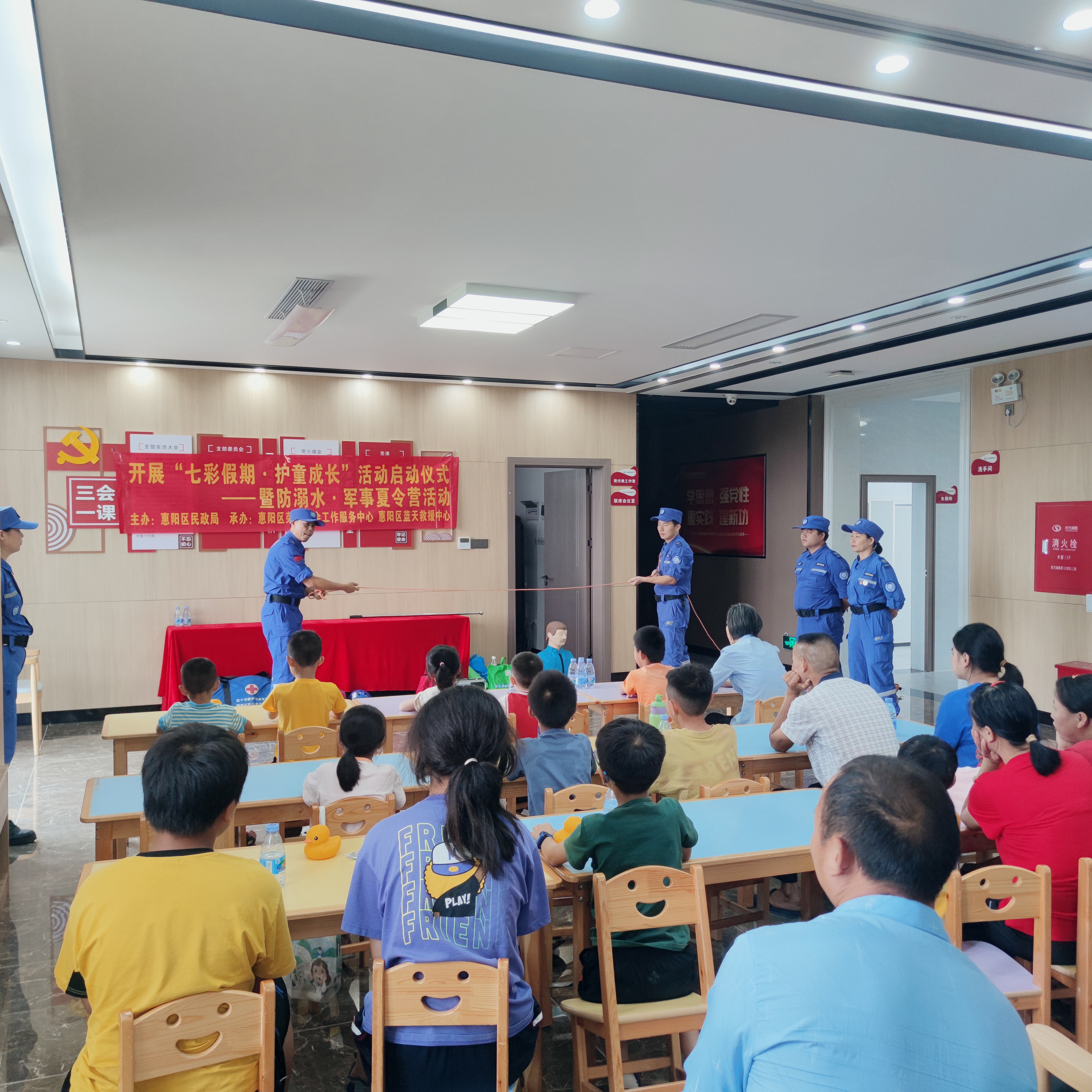 活動(dòng)邀請了藍(lán)天救援服務(wù)中心專業(yè)隊(duì)員為孩子們講授防溺水知識(shí),通過溺水救援模擬,讓兒童認(rèn)識(shí)到溺水危害,同時(shí)還教授了心肺復(fù)蘇要領(lǐng)、正確使用除顫儀等應(yīng)急技能。此外,還開展軍訓(xùn)體驗(yàn),激發(fā)孩子們的內(nèi)驅(qū)力、增強(qiáng)愛國情懷和責(zé)任感。期間,社工及工作人員還為家長和孩子們普及了《未成年人保護(hù)法》六大保護(hù)內(nèi)容,派發(fā)了關(guān)愛留守兒童、困境兒童手冊和預(yù)防未成年人犯罪宣傳手冊,并為兒童發(fā)放歡樂零食禮包、水壺等慰問物資。