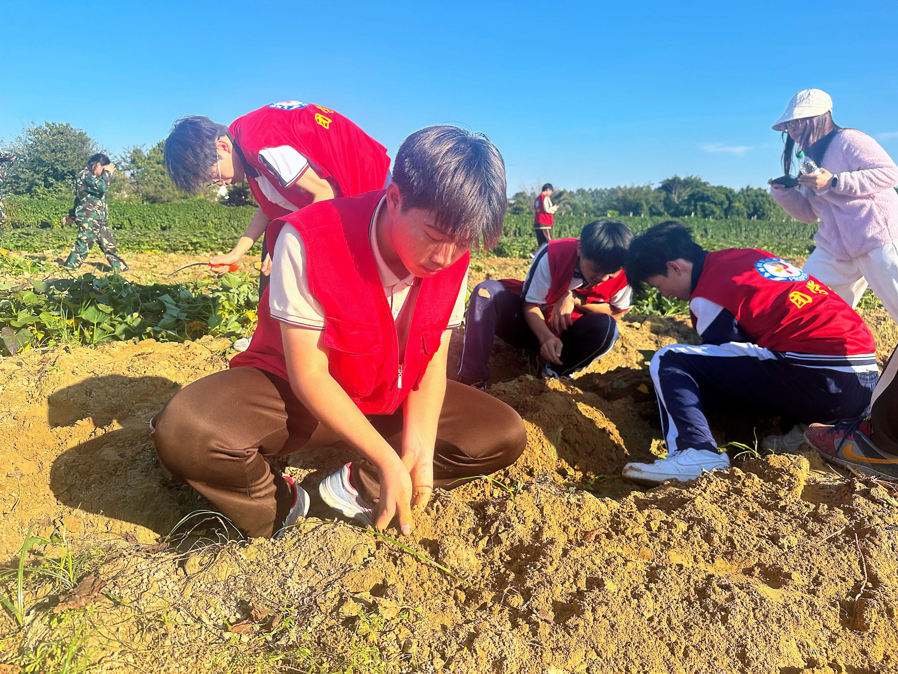 淮山農(nóng)業(yè)公園的紅薯地眼下正迎來(lái)收獲季。“到了紅薯收獲時(shí)節(jié),得知該村人手緊張、農(nóng)活繁重,結(jié)合學(xué)校‘行走的思政課’,我們組織黨員、團(tuán)員開(kāi)展了這場(chǎng)志愿活動(dòng)!被葜菔胁┵惣脊W(xué)校黨支部副書記、校長(zhǎng)助理陳妙玲介紹,這場(chǎng)別樣的思政課在發(fā)起時(shí)就得到大家踴躍支持。