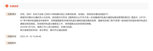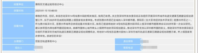 惠陽區(qū)交通運輸局信訪中心也在“惠民在線”回復(fù)指,深圳市發(fā)改委目前正組織開展深圳市城市軌道交通第五期建設(shè)規(guī)劃調(diào)整工作,擬于2025年完成規(guī)劃調(diào)整上報國家發(fā)改委審批。