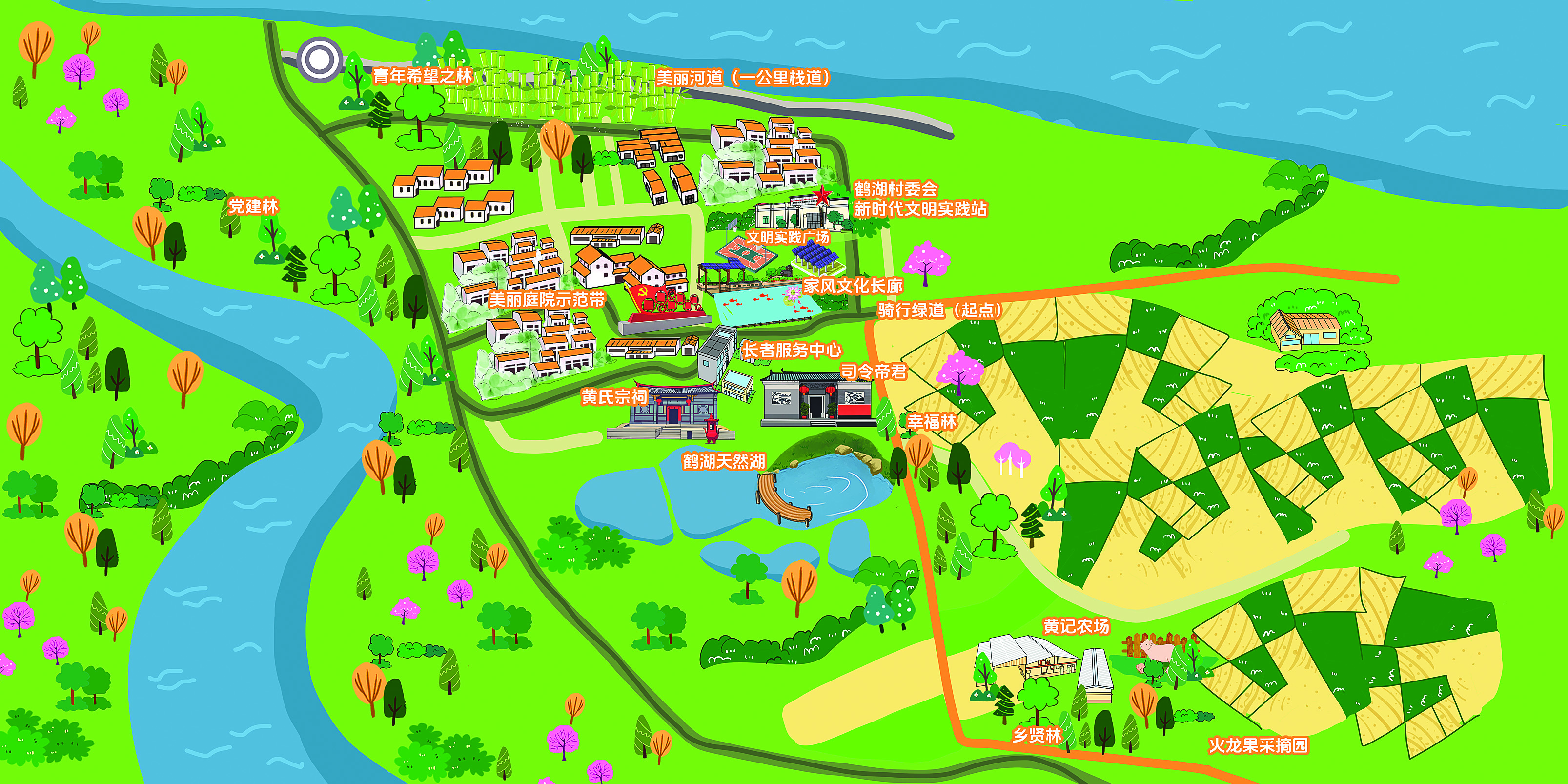 “通過(guò)打造,我們的村莊越來(lái)越美了!柄Q湖村黨總支書(shū)記徐冠嶺表示,村莊以“記得住鄉(xiāng)愁”為發(fā)展定位。日前,該村發(fā)布首張農(nóng)文旅路線圖,上面詳細(xì)標(biāo)注青年希望之林、美麗庭院示范帶、家風(fēng)文化長(zhǎng)廊、文明廣場(chǎng)、騎行道、鶴湖天然湖、黃氏宗祠、賢林、采摘園等地方,為游客勾勒出一幅“按圖索驥”的鄉(xiāng)村游玩指南。這也標(biāo)志著鶴湖村農(nóng)文旅融合邁入新階段。