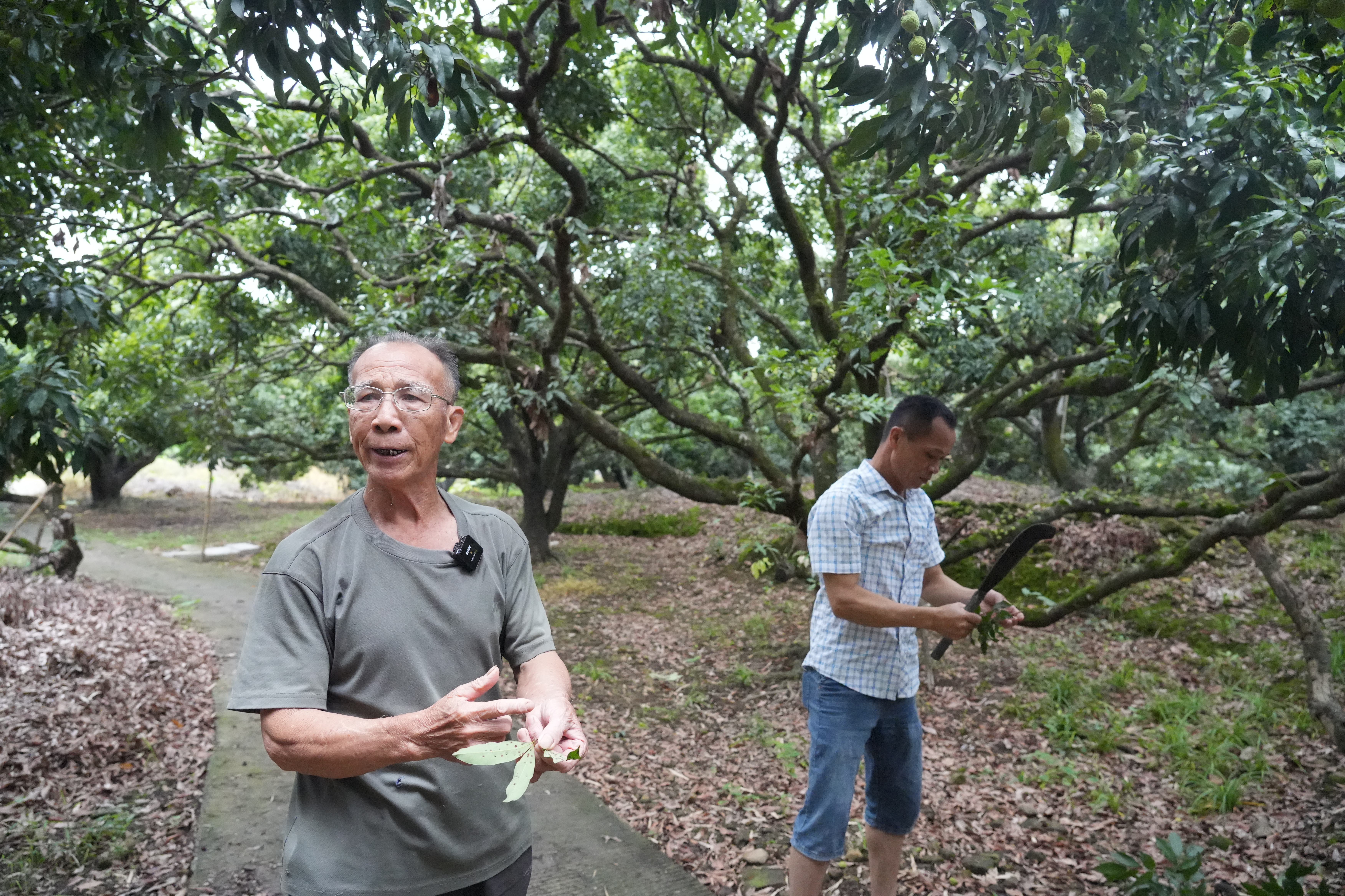 盡管年事已高,“新叔”每天仍會到果園查看荔枝生長情況,修剪枝葉、撐起果枝……他笑稱這是鍛煉身體,可不一會兒他衣服就忙汗?jié)窳恕?
