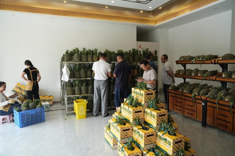 踏入營(yíng)地,連片鳳梨長(zhǎng)勢(shì)喜人。金黃飽滿的鳳梨在陽(yáng)光下閃耀著誘人光澤。據(jù)營(yíng)地負(fù)責(zé)人黃維介紹,這里是惠州較早種植鳳梨的園地。他于2017年接手運(yùn)營(yíng),引入“臺(tái)農(nóng)22號(hào)”鳳梨(俗稱“西瓜鳳梨”),該品種果大汁多,口感純甜少渣,是鳳梨中的上乘之選。這里地勢(shì)平坦、日照充足,黑質(zhì)土壤排水性好,為鳳梨生長(zhǎng)提供絕佳環(huán)境,出品鳳梨單果重超5斤,最大可達(dá)10斤。