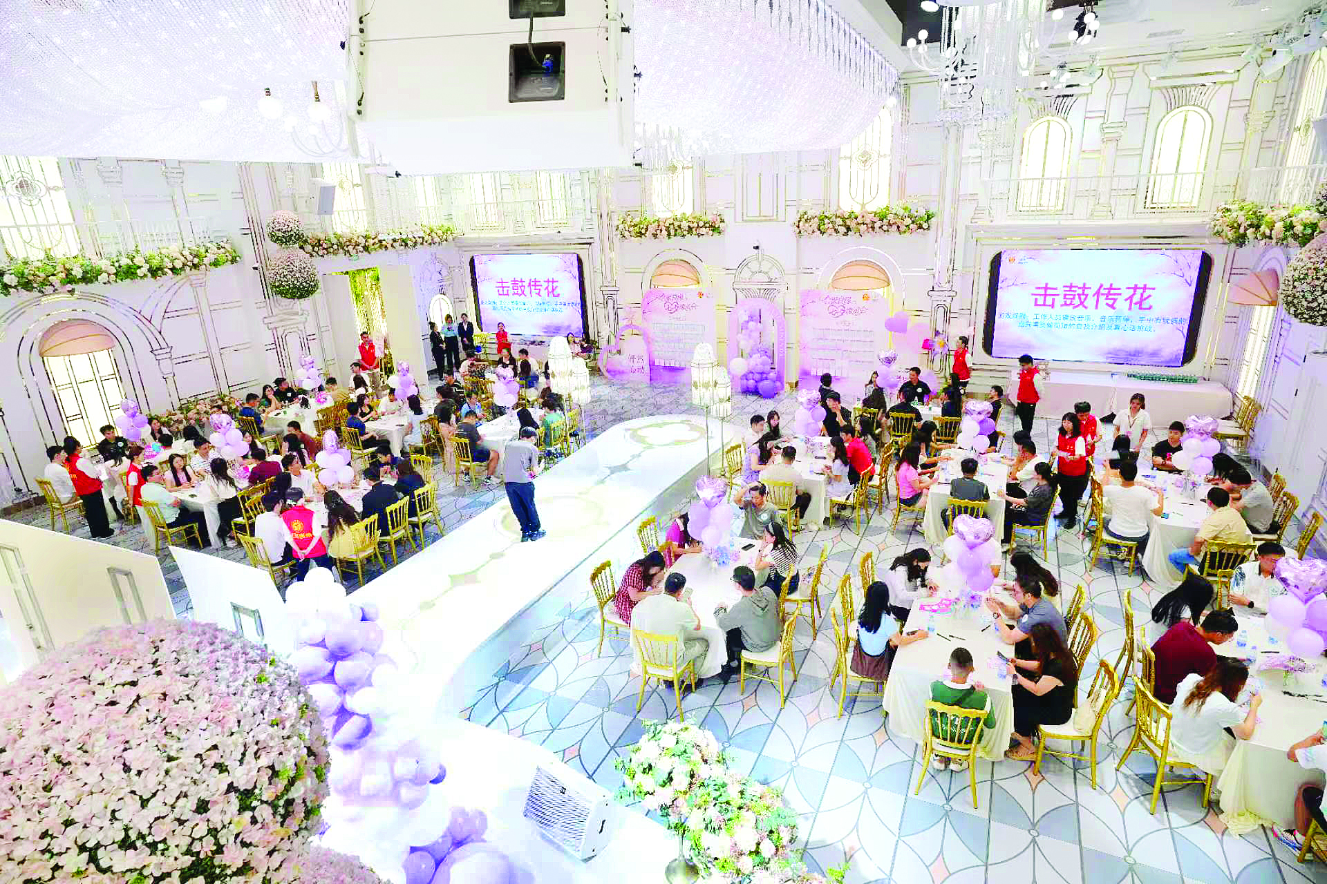 現(xiàn)場以鮮花和氣球精心裝點,處處洋溢著浪漫氣息。在獨具特色的“桃花簽”簽到墻前,嘉賓們留下專屬印記,懸掛的個人資料卡如朵朵桃花綻放緣分的可能。