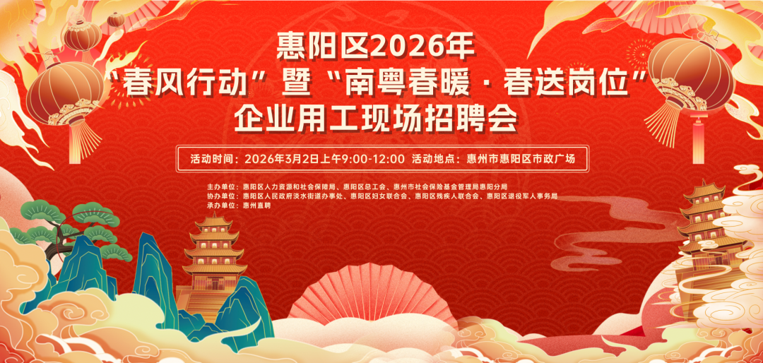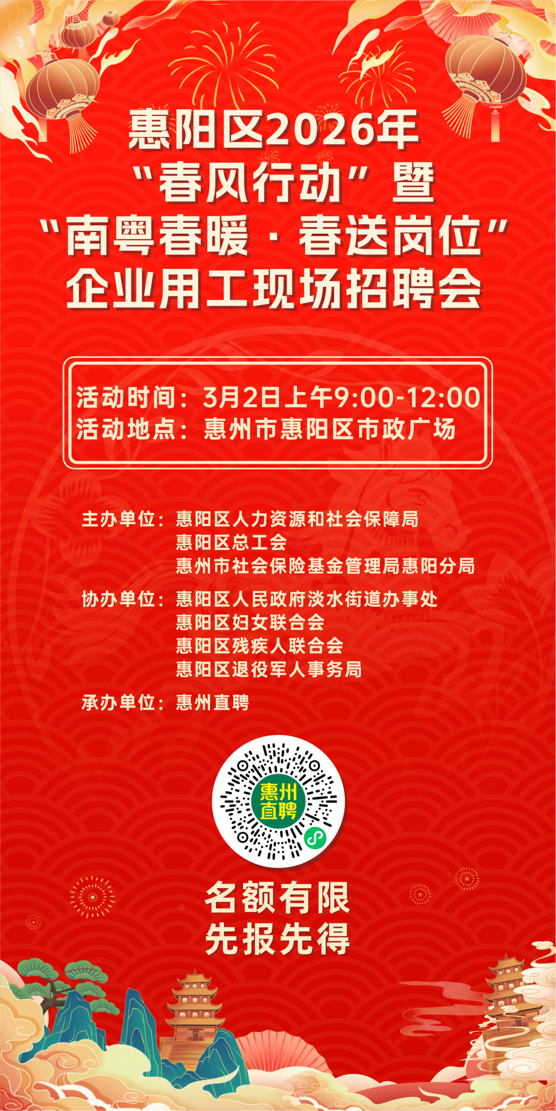 春風(fēng)送崗惠民生,南粵春暖啟新程。為落實(shí) “穩(wěn)就業(yè)、促發(fā)展” 部署,由惠陽區(qū)多部門聯(lián)合打造的2026年“春風(fēng)行動(dòng)” 暨 “南粵春暖·春送崗位” 企業(yè)用工現(xiàn)場(chǎng)招聘會(huì)即將盛大啟幕!這場(chǎng)政企協(xié)同的招聘盛宴,既是企業(yè)搶占節(jié)后人才紅利的核心陣地,也是求職者邂逅馬年理想工作的好時(shí)機(jī),3月2日,惠陽區(qū)市政廣場(chǎng),邀你共赴 “職” 面之約!