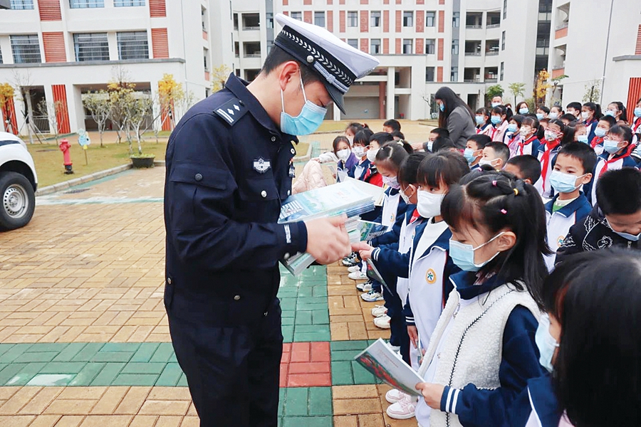 民警給學(xué)生派發(fā)交通安全宣傳小冊(cè)子;葜萑?qǐng)?bào)記者黃宇翔 通訊員龍融心 攝