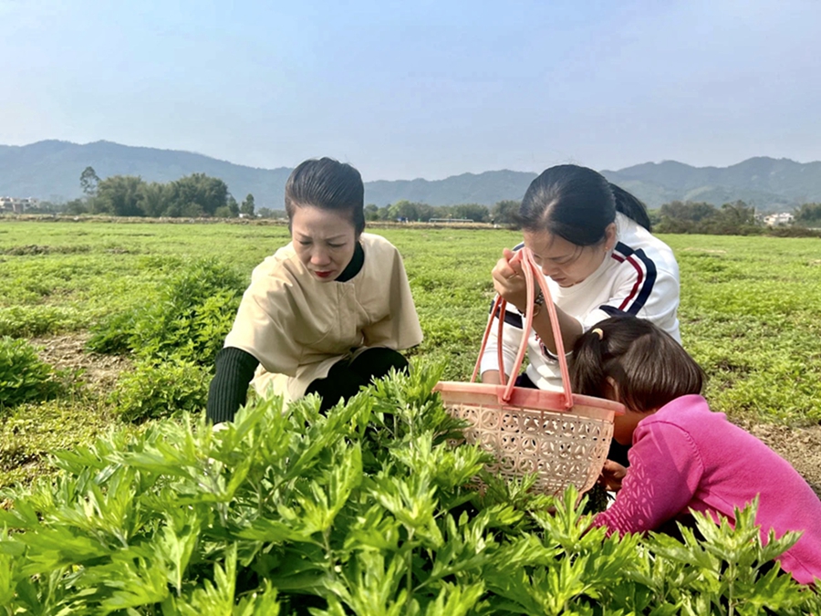 鐘曉燕(左一)與村民采摘成熟的艾草。 惠州日報(bào)記者黃宇翔 通訊員龍融心 攝