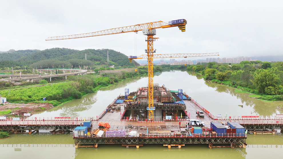龍門大橋新建工程項目施工現(xiàn)場塔吊林立、機(jī)器轟鳴。 惠州日報記者湯渝杭 攝