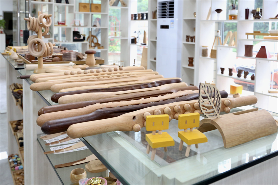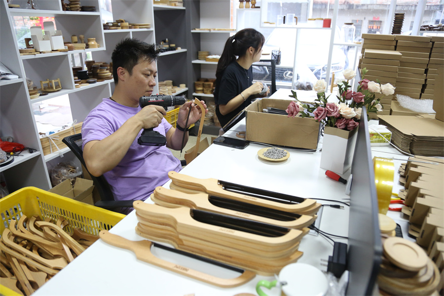 龍?zhí)兜哪局破凡怀钿N路,一方面是因為這一行業(yè)的市場廣闊。木制產(chǎn)品涉及日常生活的方方面面,從瓶蓋、桌腿、衣托、門把手、刀柄,到各類廚具、家具,處處都有木制品的“身影”。相較于塑料,木頭更具厚重感和層次感,近年來,不少奢侈品也開始頻繁使用木制配件,市場需求量越來越大。另一方面,則是產(chǎn)品的全面“觸網(wǎng)”。2010年前后,在當(dāng)?shù)卣拇罅ν苿酉,竹木制品加工企業(yè)開始通過電商平臺推銷產(chǎn)品。隨后,龍門縣也建起竹木制品電商產(chǎn)業(yè)園!斑M駐電商平臺后,行業(yè)迎來飛速發(fā)展時期!睋(jù)葉雨波介紹,線下生產(chǎn)、線上銷售的經(jīng)營模式讓龍?zhí)吨衲局破沸袠I(yè)發(fā)生了“蛻變”,產(chǎn)品銷路進一步拓寬。如今,龍?zhí)舵?zhèn)加入電商平臺的竹木加工企業(yè)超1000家,不少企業(yè)把生意做到了海外。