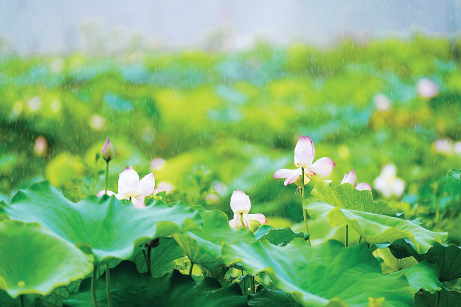眼前,百畝荷塘里荷葉重重疊疊,荷花嬌艷欲滴、爭相斗艷,滴滴雨珠掛在花瓣上、荷葉上,像晶瑩的珍珠。