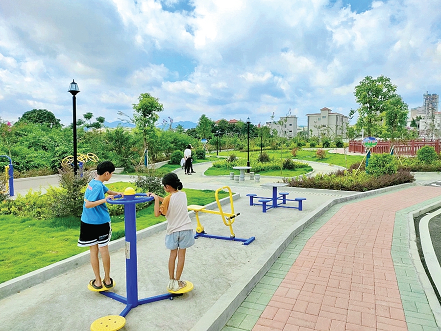 晨光村的孩子們在漂亮的文體廣場上玩耍。
