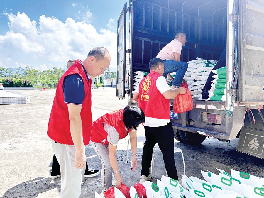 駐村干部和農(nóng)戶們將農(nóng)副產(chǎn)品搬運(yùn)上車。 惠州日報(bào)記者黃宇翔 通訊員龍融心 攝