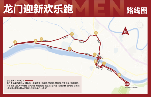 龍門縣青少年活動(dòng)中心(起點(diǎn))—香濱東路—樂和路—甘西路—甘香大橋—西林路—環(huán)城南路—環(huán)城西路—龍門中學(xué)(沿江道路)—294鄉(xiāng)道—環(huán)城北路—城東路—甘香大橋—甘西路—樂和路—香賓東路—龍門縣青少年活動(dòng)中心。