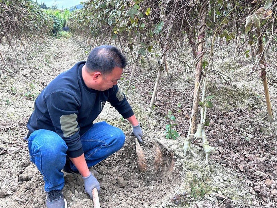 “一般情況下,每年3月份,農(nóng)戶們就開(kāi)始種植粉葛,當(dāng)年11月底便可陸續(xù)采收。”當(dāng)?shù)胤鄹鸱N植大戶廖衛(wèi)光說(shuō),今年,他種有粉葛30多畝,畝產(chǎn)大概1000公斤。目前,粉葛市場(chǎng)行情較好,市場(chǎng)價(jià)每公斤約12元至16元。記者在廖衛(wèi)光家的粉葛種植地看到,成片的粉葛樹(shù)雖被霜打得葉子枯黃,但地下的粉葛大多飽滿粗壯。廖衛(wèi)光熟練地用鋤頭順著粉葛根莖的方向挖下去,一根粗壯結(jié)實(shí)的粉葛就從泥土中露了出來(lái)。