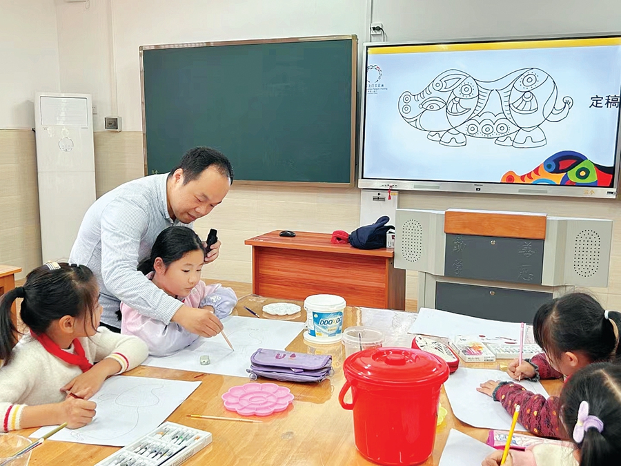 龍門農(nóng)民畫協(xié)會會長鐘永廉與學(xué)生互動交流繪畫技巧。