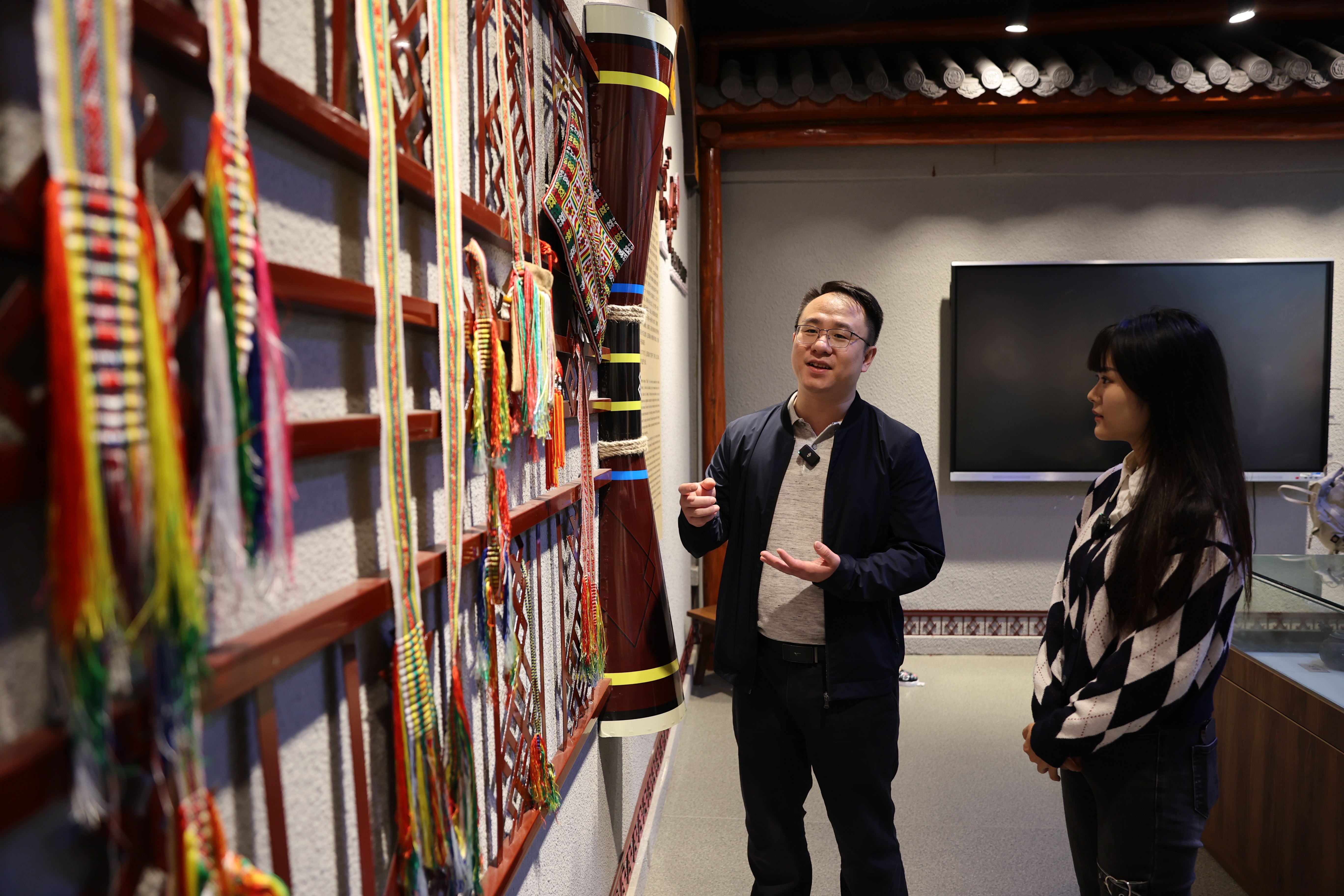 駐藍(lán)田瑤族鄉(xiāng)幫鎮(zhèn)扶村工作隊(duì)隊(duì)長(zhǎng)邱歡(左)向記者介紹藍(lán)田瑤族文化展覽館內(nèi)陳列的各類展覽品。