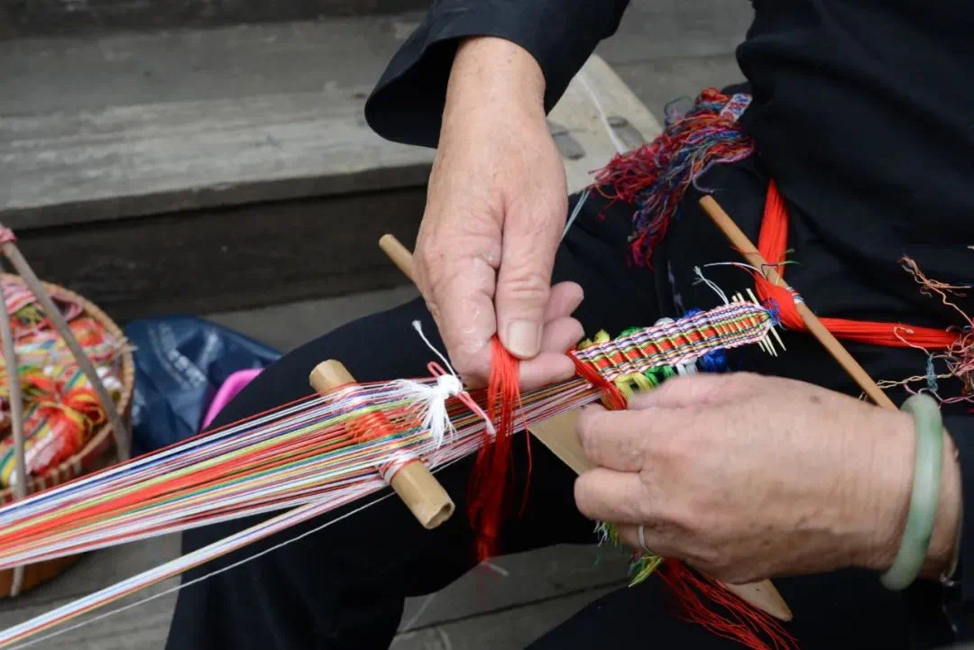 織帶仔考驗(yàn)的是耐心,需要用六七十條乃至上百條絲線進(jìn)行編織,另外,織帶仔也講究季節(jié),夏天炎熱,手指容易出汗,會(huì)影響帶仔的質(zhì)量。因此,一般要到秋涼才開(kāi)始織帶仔。織好的帶仔上,有豬肚、雞嘴、筷子、欖仔欖殼、松仁松籽等圖案。在藍(lán)田瑤族鄉(xiāng)的方言中,松籽和“重喜”相近,欖仔和“攬子”相近,而雞嘴、豬肚則是農(nóng)耕生活的象征。