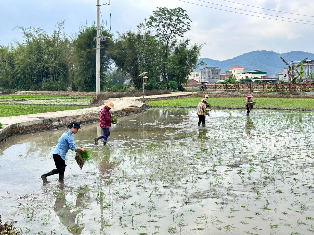 位于平陵街道黃沙村的龍門縣金禾田稻谷專業(yè)合作社的稻田里,10余名農(nóng)民正在進(jìn)行人工插秧,他們一手抱秧、一手插秧,手法嫻熟,動作利落,將一株株嫩綠的秧苗整齊地插入水田中,一排排翠綠的秧苗為農(nóng)田披上“綠裝”。