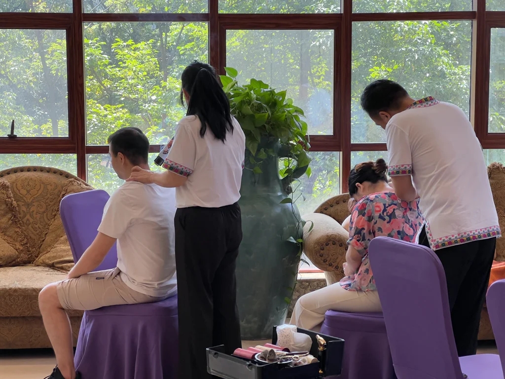 游客在活動(dòng)現(xiàn)場(chǎng)體驗(yàn)“中醫(yī)-溫泉-艾灸”模式帶來的康養(yǎng)效果。